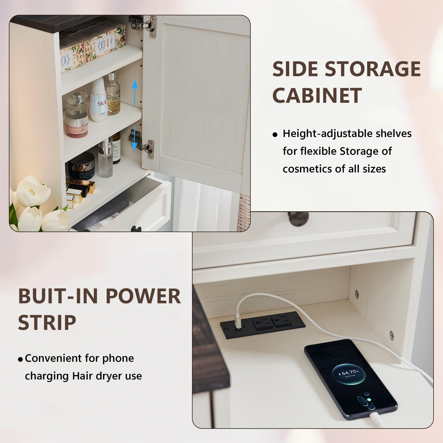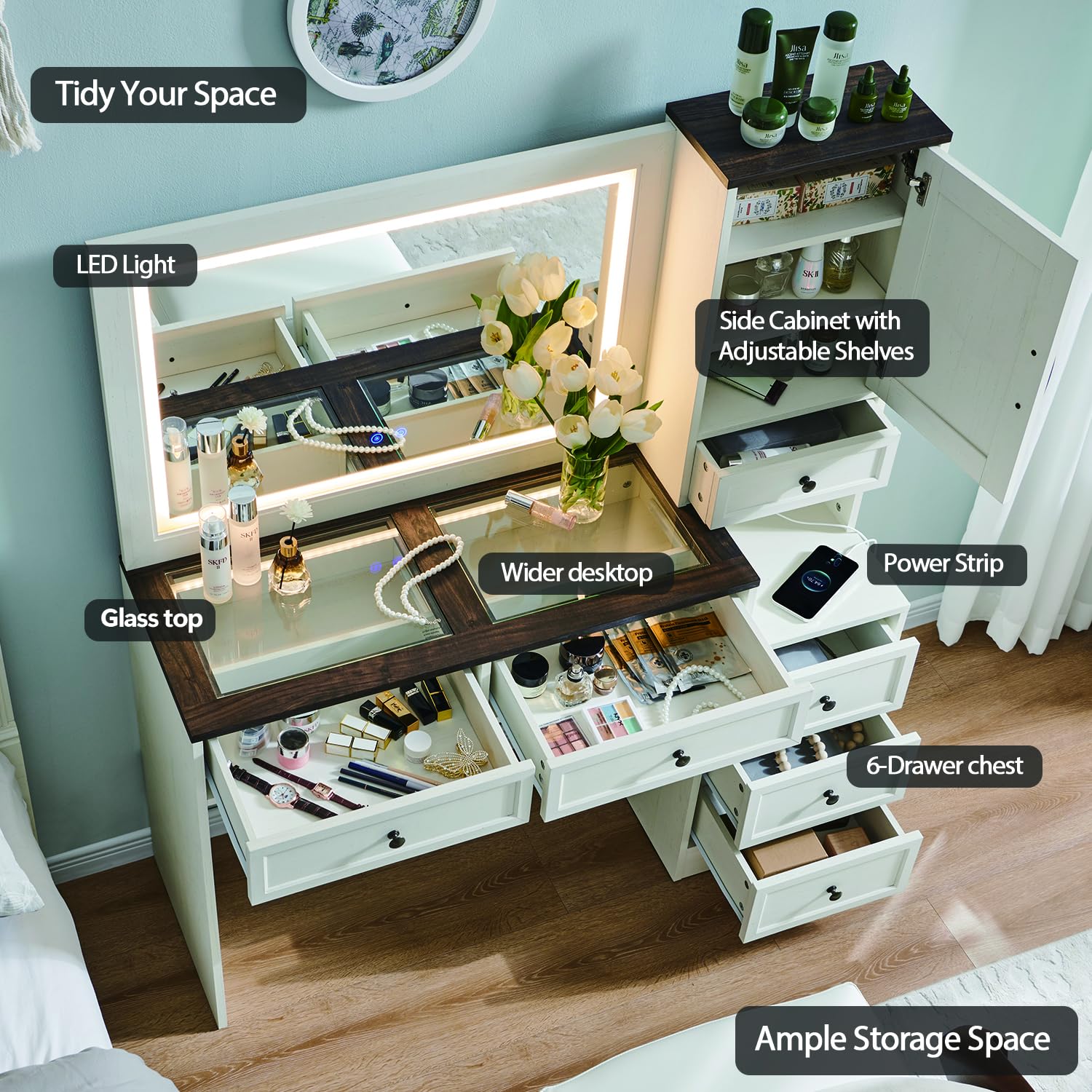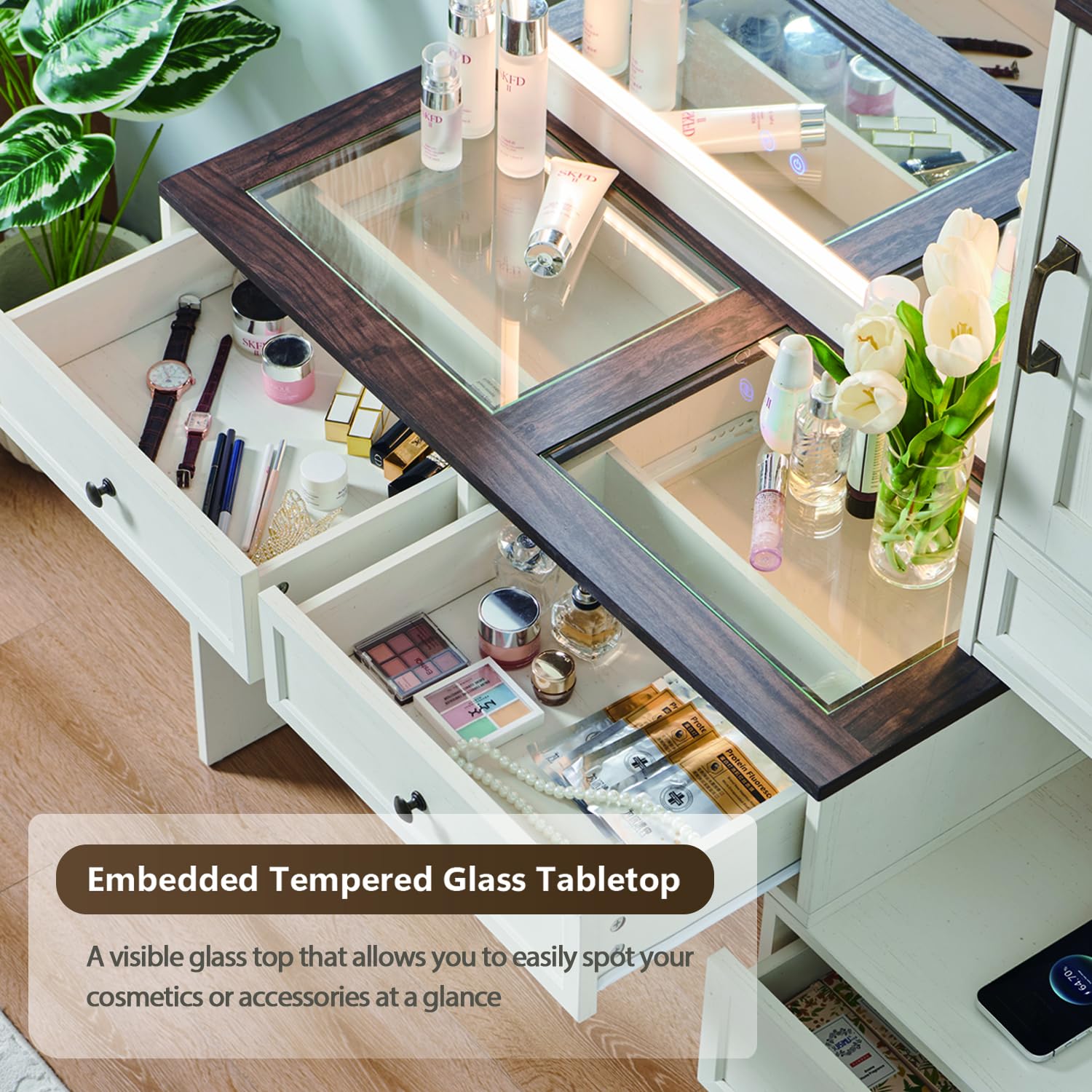 - Glass Top & Convenient Charging: The glass top vanity’s transparent tempered glass tabletop allows you to clearly see the contents inside, making it easy to find your items. Additionally, a built-in charging station on the side provides convenient access to power curling irons, beauty tools, hair dryers, and mobile phones without taking up desk space, improving both safety and usability