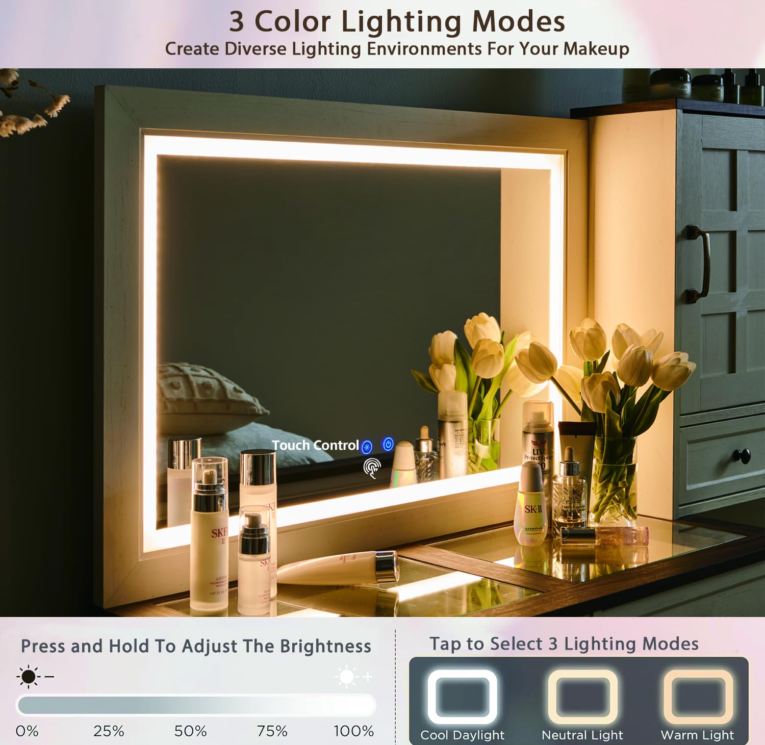 - LED Lighted Vanity Mirror Desk: Featuring a 34.7" L x 23.4" W high-quality LED lighted mirror, this vanity with glass top offers three adjustable lighting modes—warm, natural, and cool. Ideal for home makeup, salons, and live broadcasts, you can easily switch between modes with a simple touch. Press and hold the button to adjust the brightness, ensuring perfect lighting for daily use or special occasions