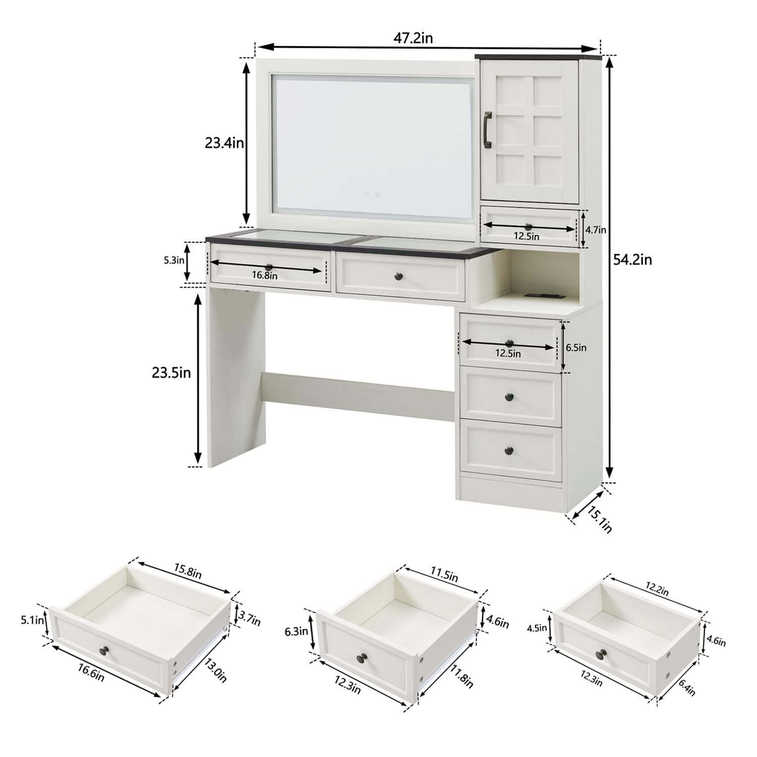 - Spacious Makeup Vanity: This large vanity set measures 47.2" W x 15.1" D x 54.2" H and includes 2 large drawers, perfect for storing jewelry, trinkets, or makeup tools, keeping them easy to find. Additionally, the 4 small drawers help neatly arrange various cosmetics and personal items, ensuring organized storage. The adjustable closed storage cabinet provides ample space for your makeup essentials and accessories