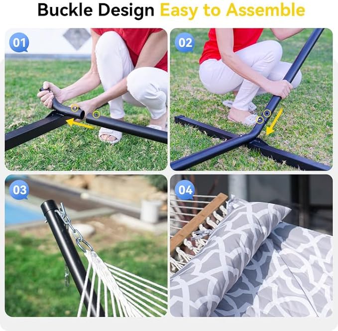 - 【High Quality, Easy To Setup】: The stand of the double hammock is made of heavy-duty steel, solid and durable. No tools are required—simply use the snap-on mechanism to quickly lock the joints and set it up in minutes. So you can enjoy the fun of the hammock for indoor and outdoor use.